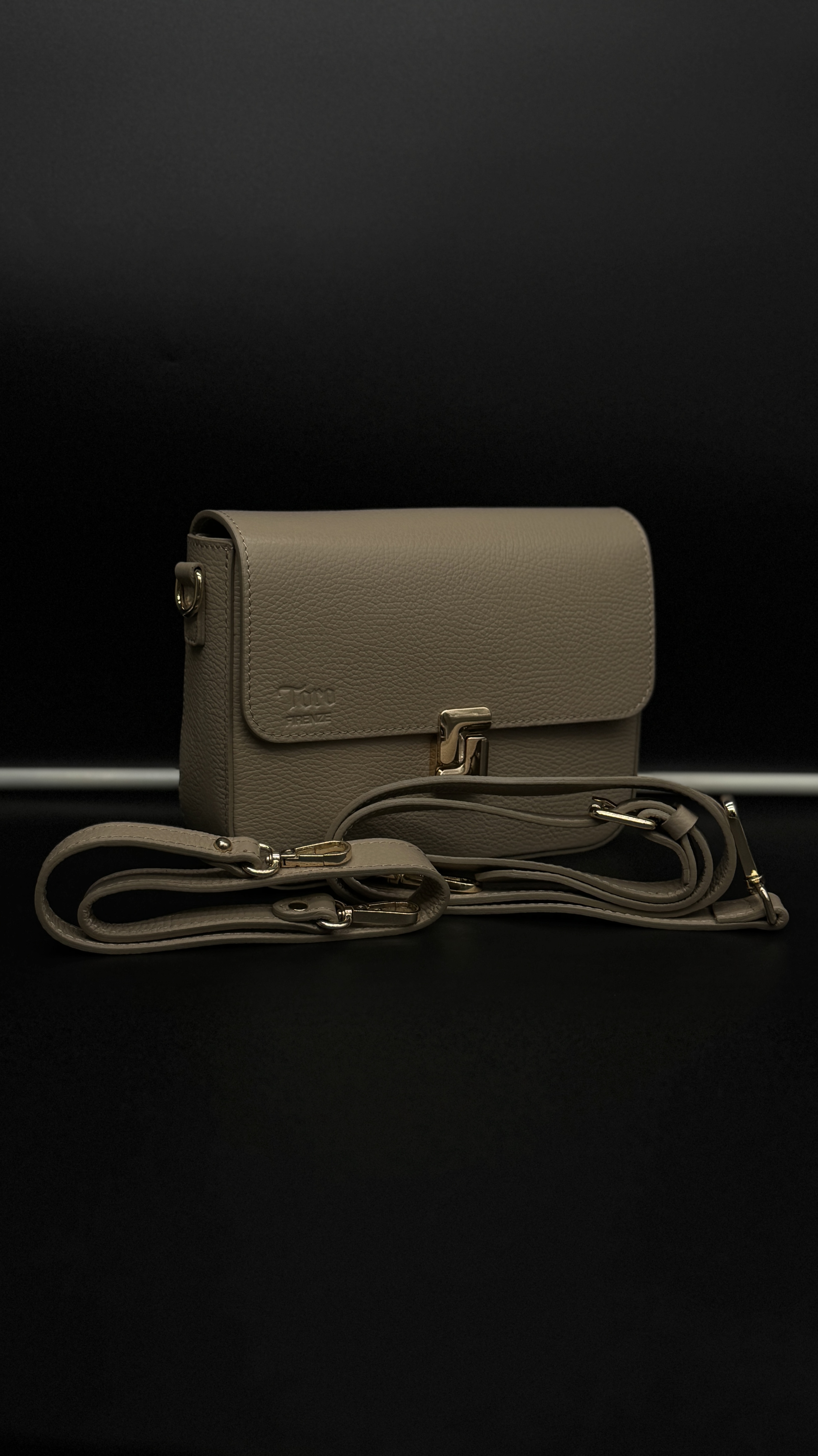 Genuine leather product manufactured by Toro Firenze. It features two removable straps: a smaller, fixed-length strap ideal for hand carry, and a larger, adjustable strap for shoulder use, offering practicality and comfort for everyday wear.
